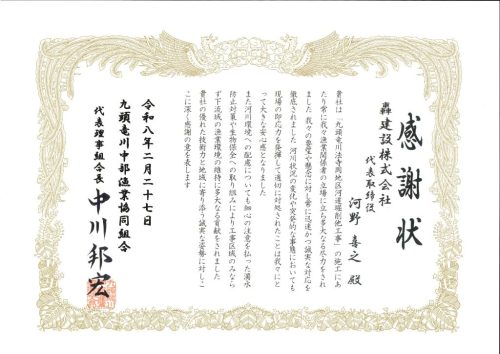 轟建設が受注しました『九頭竜川法寺岡地区河道掘削他工事』において、 九頭竜川中部漁業協同組合様より感謝状をいただきました。 竣工は、3月25日です。 竣工まで、ラストスパート! 無事故・無災害で終えれるように努めて参ります。